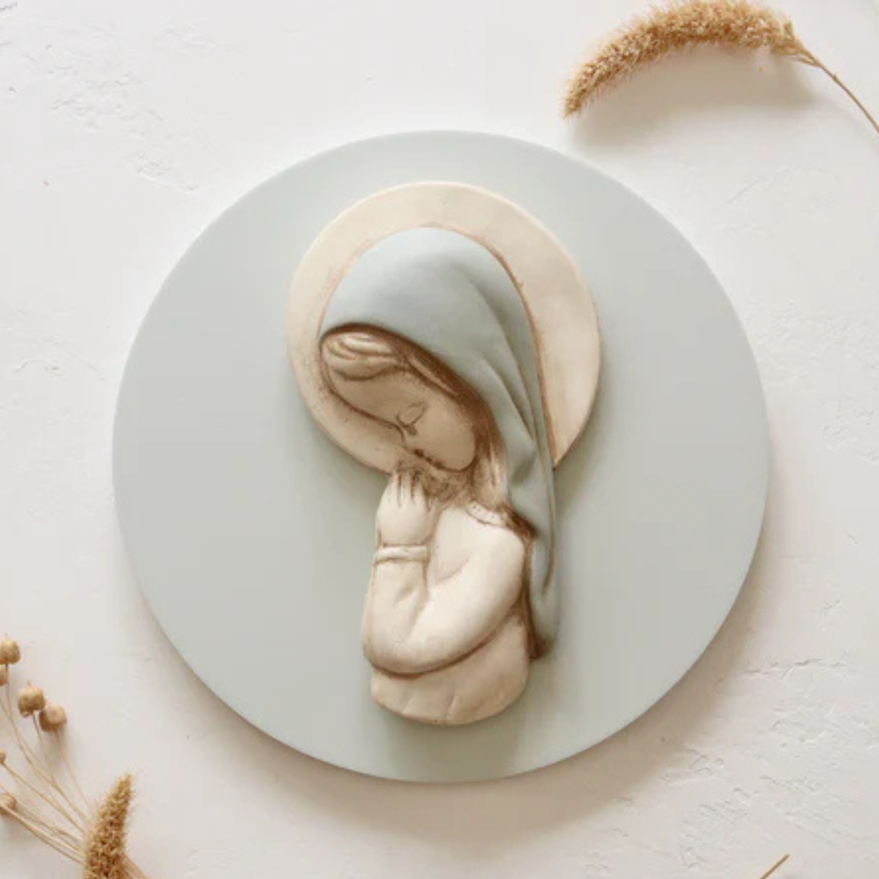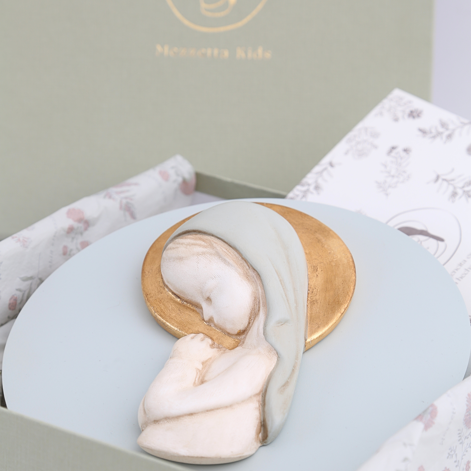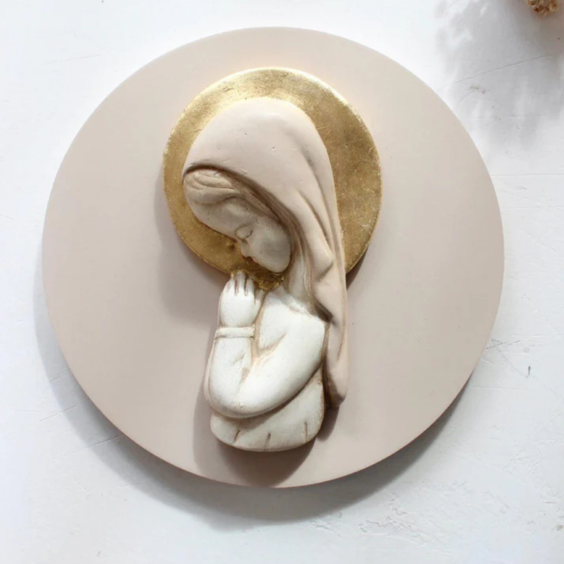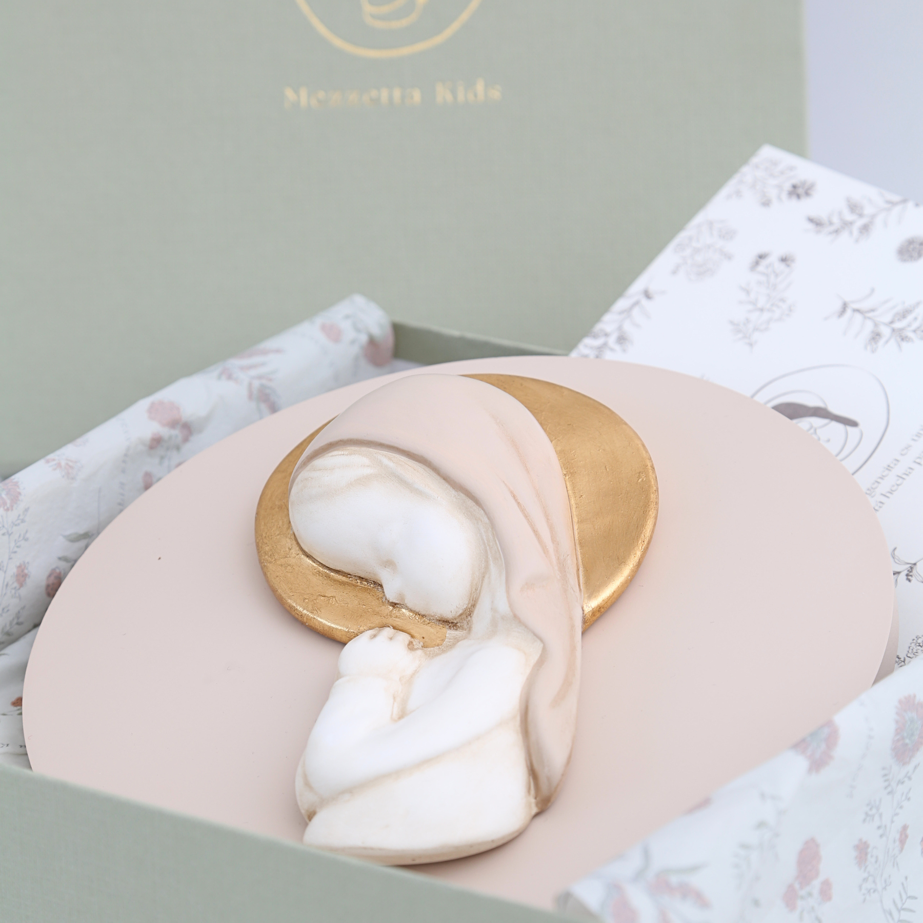 Virgen artesanal de Mezzetta Kids, elaborada y pintada a mano, con corona en pan de oro. Queda ideal colgada en la pared o apoyada en la mesilla. Disponible en fondo rosa (niña) o azul (niño). Medidas: 20 cm de diámetro x 5 cm de altura. Un regalo delicado y para toda la vida.