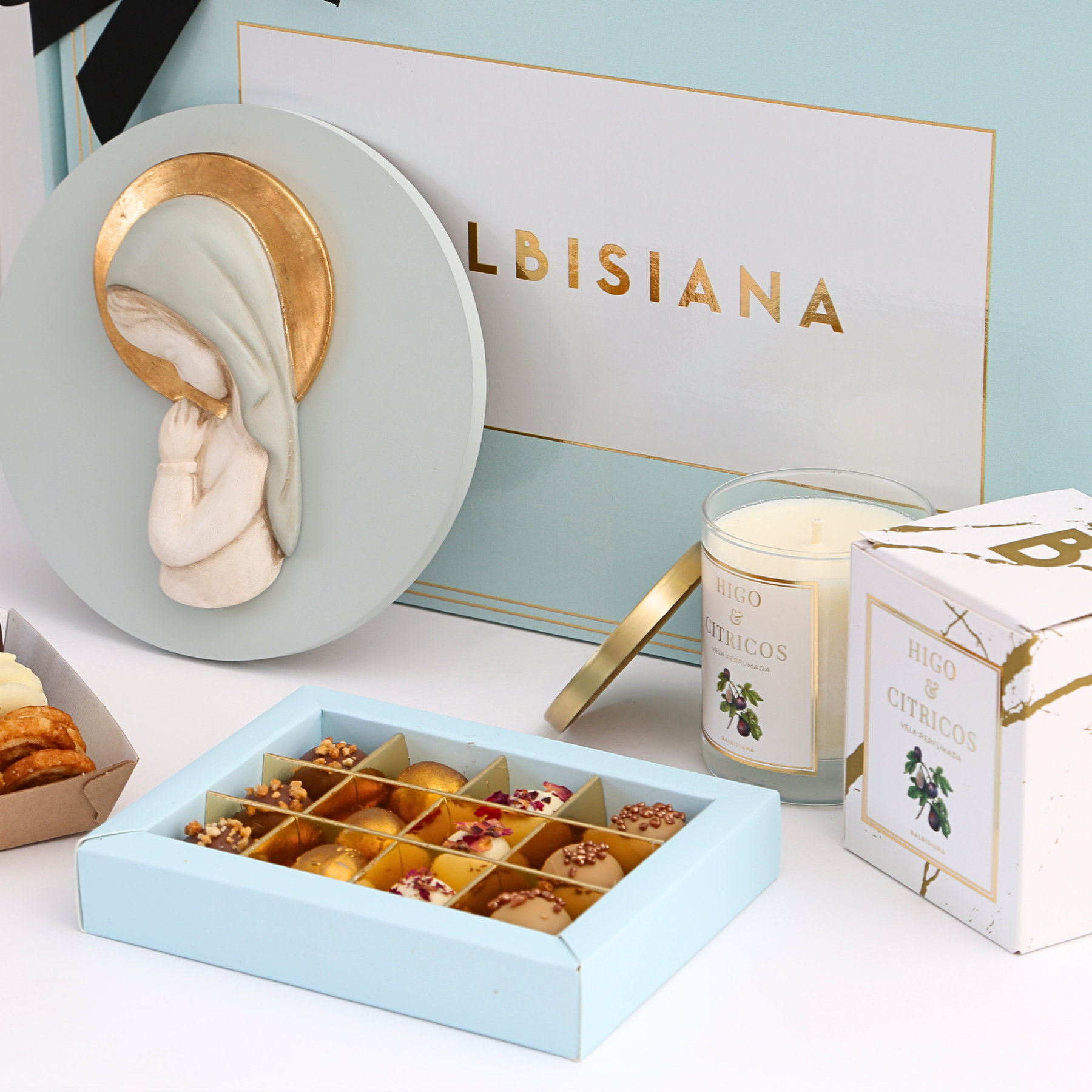 En su interior, encontrarás una cuidada selección de productos que destacan por su calidad y elegancia. Incluye una vela Balbisiana aromática, con fragancias envolventes de jazmín y nardos o higo y cítricos (envío aleatorio), ideal para crear un ambiente cálido y especial en casa.